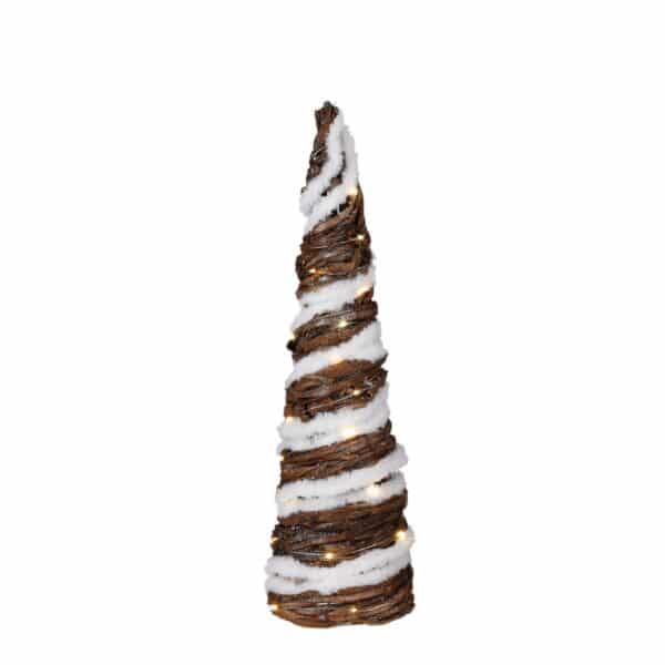 Kegleformet træ i naturmaterialer med LED-lyskæde med 40 lys, der snor sig rundt om sammen med blød, hvid guirlande. Meget dekorativ på borde, skænke eller i vindueskarme.Mål:Diameter: 19 cmHøjde: 62 cmBruger batterier.Fremstillet i plantefibre.Pakket med