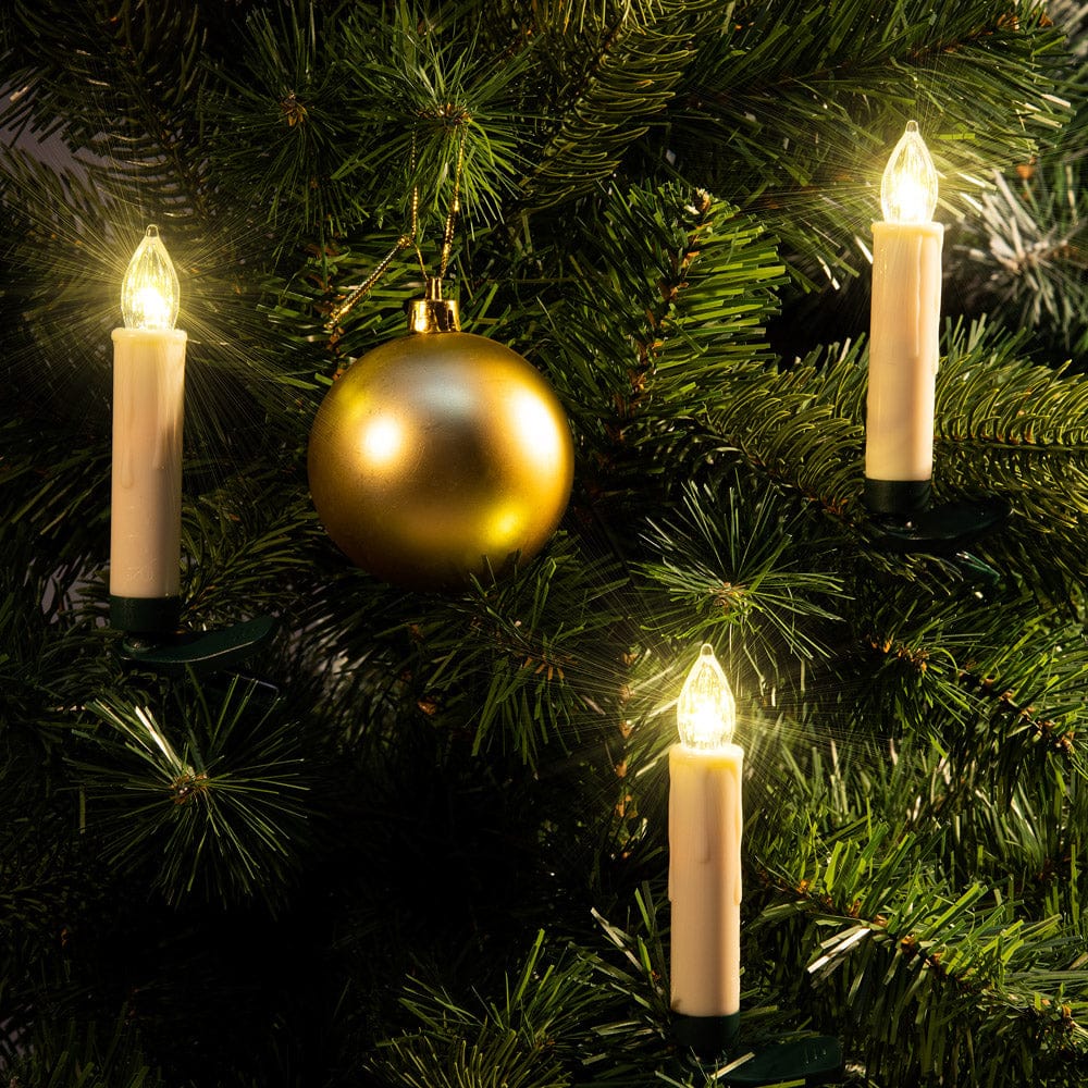 30 stk. juletræslys med fjernbetjening Takket være den økonomiske, batteridrevne LED-teknologi kan du nyde julestemningen uden farlige, åbne flammer og uden sammenfiltrede kabler. Med fjernbetjeningen kan du nemt tænde og slukke dine stearinlys fra