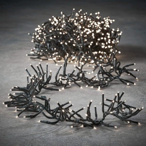 Flot lyskæde med 384 klassiske hvide LED-klyngelys. Denne populære clusterlyskæde er designet til at skabe maksimal lysfylde og hyggelig stemning både indendørs og udendørs. De tætsiddende LED-pærer giver et smukt, levende udtryk, der gør kæden ideel til