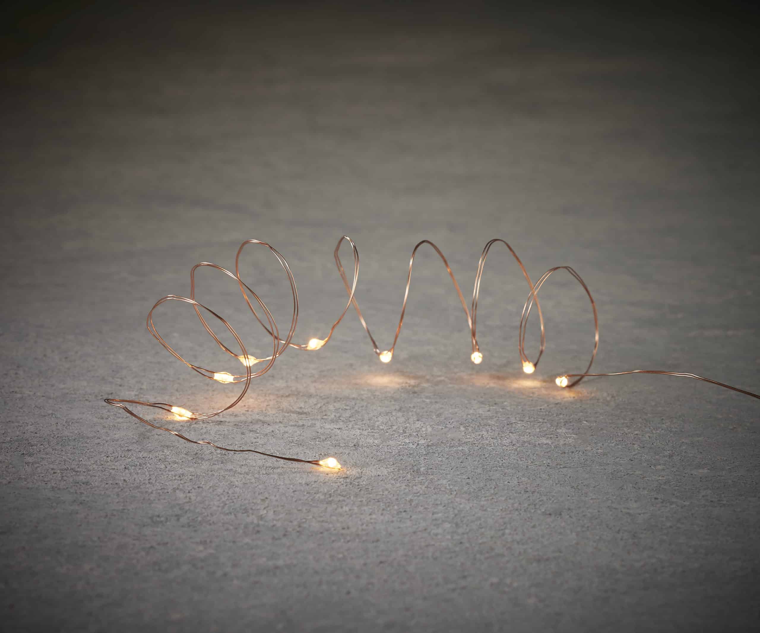 Lyskæde kobberfarver med 30 varme, hvide LED-lys. Til indendørsbrug. Batteridrevet (batterier medfølger ikke). Pakket med 1 stk.