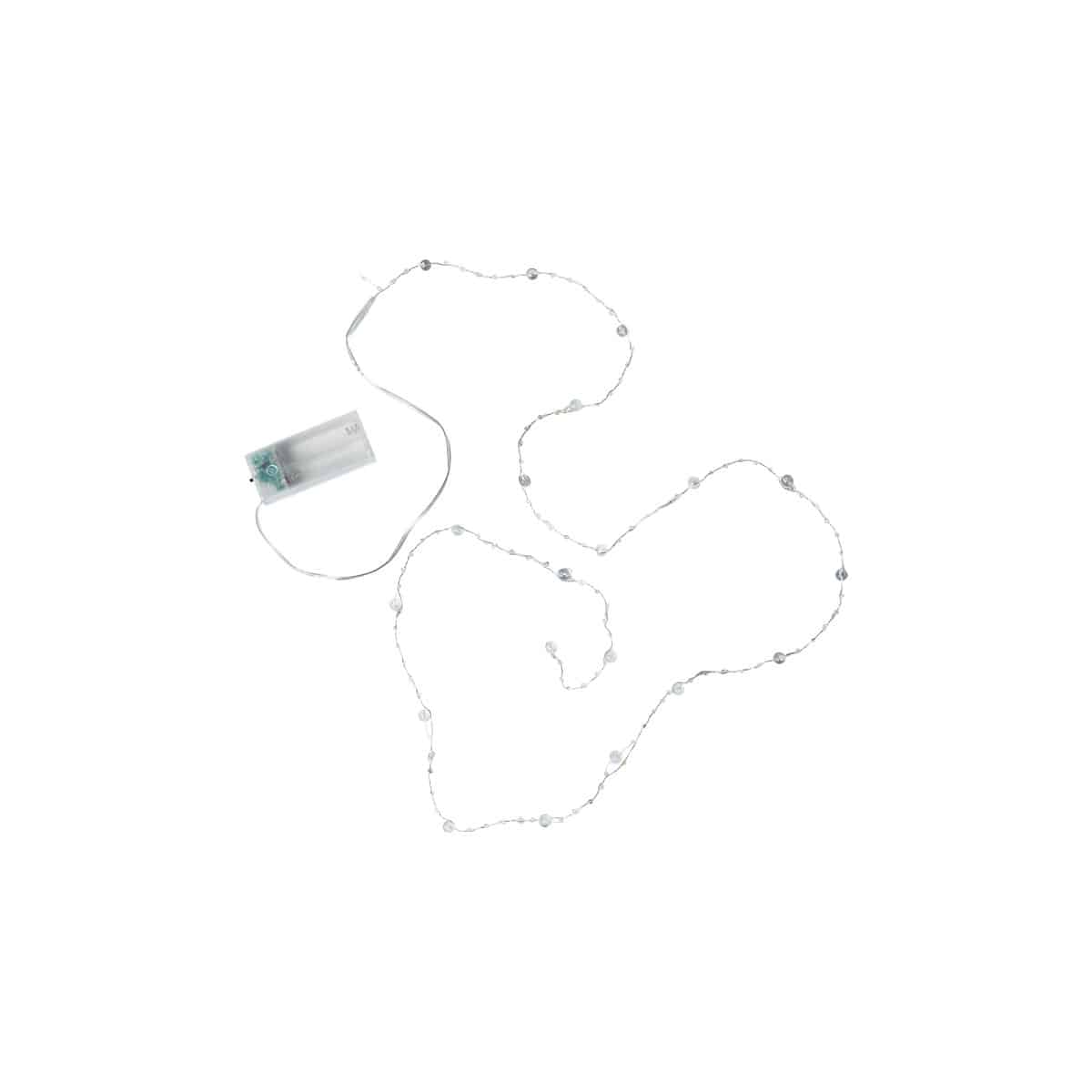 Fin lille lyskæde til dekoration med 15 lysende varmhvide LED-pærer og små dekorative klare perler. Pynt vinterens- eller julens kranse, guirlander, lanterner eller brug lyskæden som en del af bordpynten. Den er beregnet til indendørs brug. Kan kun anvend
