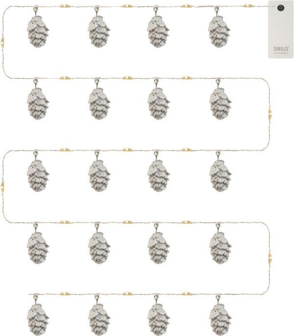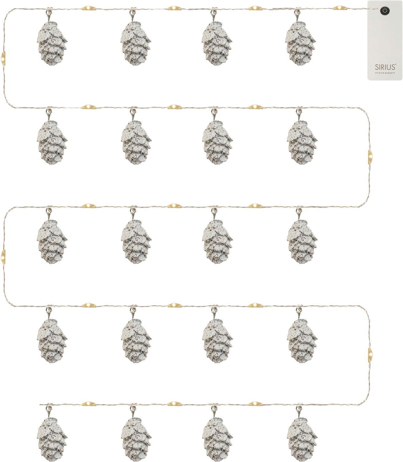 Lyskæde med kogler med sne på, den lyser med et varmt hvidt LED lys, den giver et næsten usynligt look med svævende lys pga. den tynde metaltråd lysene er monteret på. Til indendørs brug.
