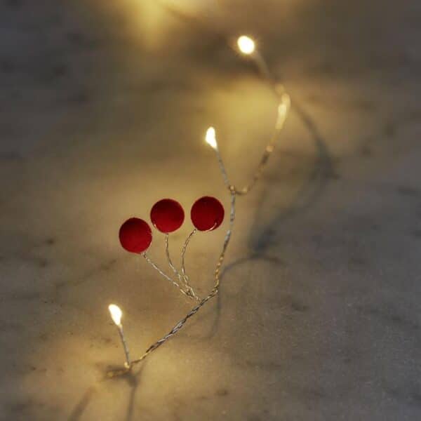 Skab en hyggelig stemning med denne dekorative LED lyskæde med 20 små varm hvide lys. Lyskæden er elegant pyntet med små røde kugler, som giver et festligt og stilfuldt udtryk perfekt til både hverdag og særlige lejligheder. Ideel til dekoration af borde