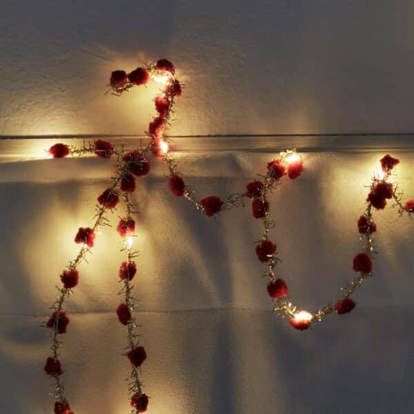 Skab en festlig og elegant stemning med denne dekorative lyskæde med 20 varm hvide LED-lys. Lyskæden er pyntet med små røde pomponer og glitrende tråde, som giver et let og luftigt udtryk med et strejf af glamour. Perfekt til borddækning, dekoration omkri