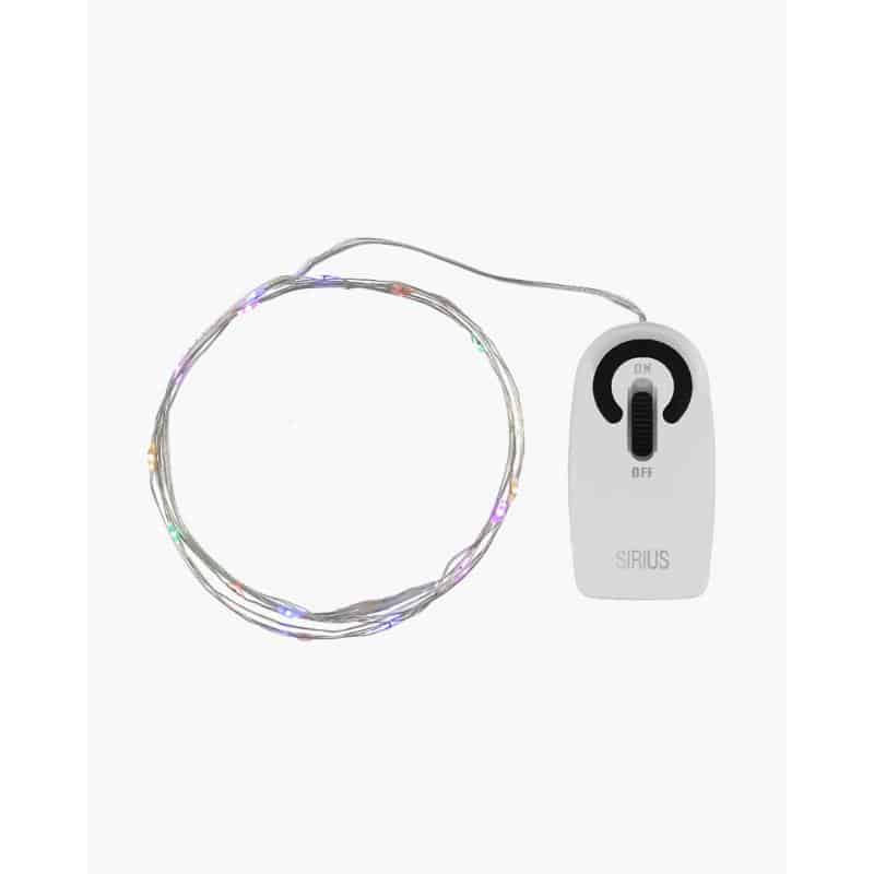 Dekorativ lyskæde med multifarvede lys og batteriboks. Egnet til indendørsbrug. Kan fint bruges hele året til at sprede hygge og stemning. Brand: Sirius Størrelse: 1,9m+30cm Energikilde: Batteri 2 x AA – 1 x CR2032Materiale: Plastik