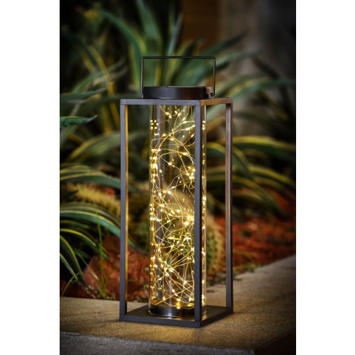 Bring hygge til terrassen med en solcelle lanterne Super flot solcelle lanterne i et firkantet desing med et smukt og stilrent naturligt udtryk. Giver et super hyggeligt lys fra den indbyggede LED lyskæde med 90 små dioder. Gennem glasrøret skinner lyskæd