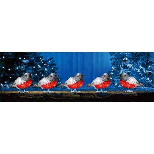 Skab et skønt julelandskab Mangler du en fin lyskæde til julesamlingen? Så kan denne model med 5 fugle være noget for dig. Fuglene er udført i hvidt akryl, og vil med sine 7-15 cm. stå flot i sneen når julesæsonen kommer. Deres 40 små LED lysdioder vil sk